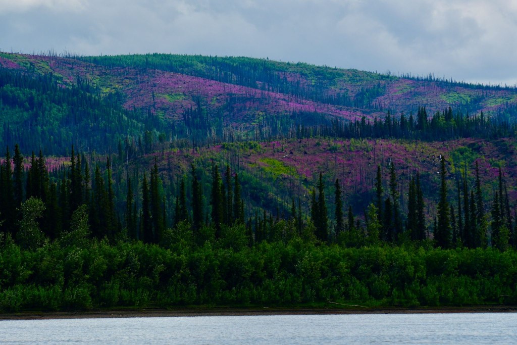 From the Dalton Highway we were headed for Tanana. The Dalton highway marks the end of The Flats, and the mountains are back! WOW. I didn’t realise how much I had missed them. They bring depth to the landscape and you have so much more to stare at through the day. The mountains to Tanana really put on a show. Firstly we paddled through some areas that had previously burned and the fireweed was growing everywhere, covering the slopes in a purple haze. Fireweed is a sign of rejuvenation that’s widely celebrated throughout the Yukon in Canada and Alaska, and I can really see why. It was a truly beautiful sight.